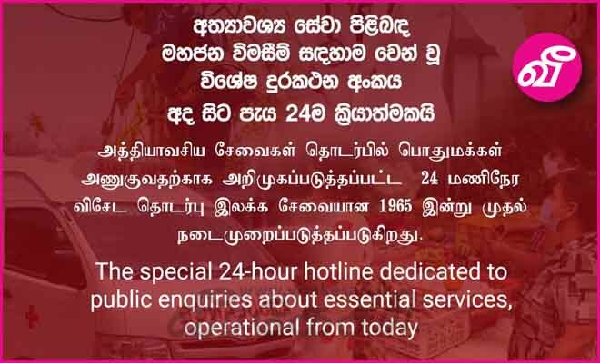 அதன்படி பிரதமரின் மஹிந்த ராஜபக்ஷவின் ஆலோசனையின் பேரில் அலரி மாளிகையில் பசில் ராஜபக்ஷவின் தலைமையில் ஜனாதிபதி செயலணியின் கீழ் அத்தியாவசிய சேவைகள் தொடர்பான பொது பிரச்சினைகளை தெரிவிப்பதற்கு 1965 என்ற புதிய ஹாட்லைன் இலக்கம் அறிமுகப்படுத்தப்பட்டுள்ளது.