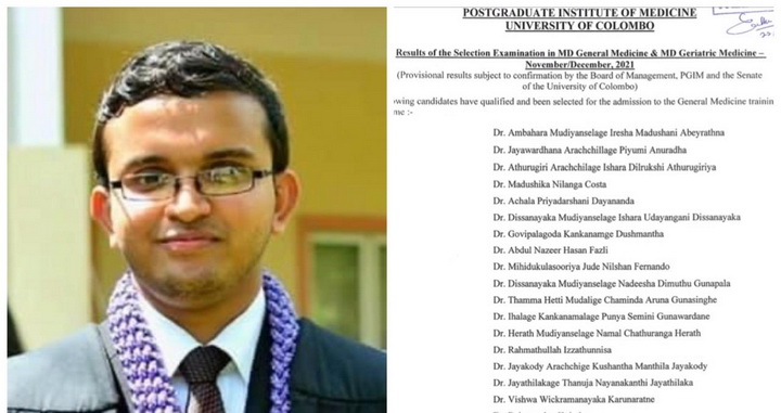 இம்முறை இலங்கை Postgraduate Institute of Medicine (PGIM),University of Colombo நடாத்திய போட்டிப்பரீட்சையில் தோற்றி சித்திபெற்றுள்ள இவர், அஸ்ஹர் கல்லூரி முன்னாள் ஓய்வு பெற்ற அதிபர் ரிழ்வான் மற்றும் ஓய்வு பெற்ற ஆசிரியை மசீனா ஆகியோரின் மகனாவார்.