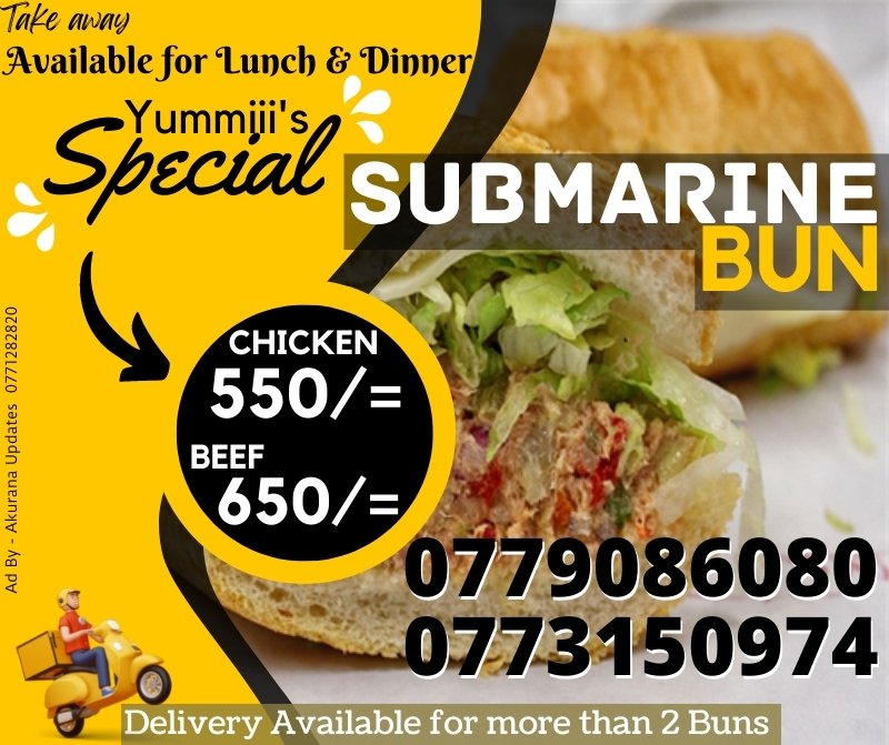 Submarine Bun Available 🥖 Chicken 550/=🥖 Beef 650/= Available from Lunch. Take away & Delivery Delivery available for more than 2 buns 🤩 CALL NOW for your ORDERS 0779086080 0773150974
