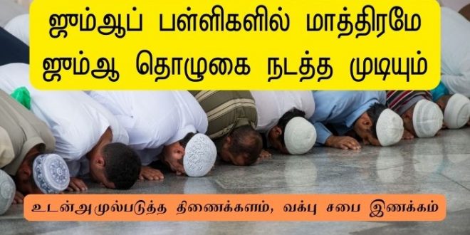 முஸ்லிம் சமய பண்பாட்டலுவல்கள் திணைக்களம், வக்பு சபையின் இணக்கத்துடன் உடனடியாக நடைமுறைக்கு வரும் வகையில் கொவிட் 19 தொற்று நோய்க்கு முன்னைய காலப்பகுதியில் ஜும்ஆ தொழுகை இடம்பெற்ற பள்ளிவாசல்களில் மாத்திரம் ஜும் ஆ தொழுகையை நடாத்துவதற்கு தீர்மானம் நிறைவேற்றியுள்ளது.