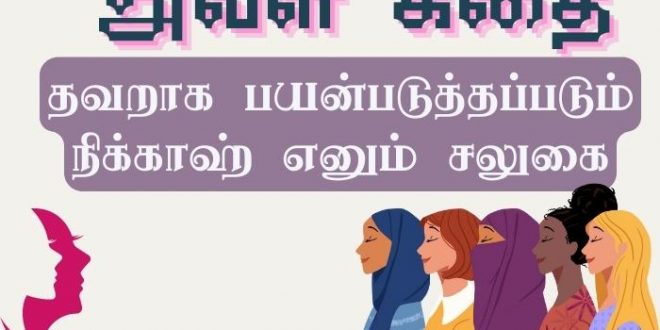 அண்மைக்காலமாக விவாகப்பதிவினை செய்து கொள்ளாது மார்க்க ரீதியான நிக்காஹ் மாத்திரம் செய்து கொண்டு கணவன், மனைவியாக வாழும் குடும்பங்களில் பல்வேறு பிரச்சினைகள் உருவாகி காதி நீதிமன்றங்களில் கால்பதித்துள்ளன. நிக்காஹ் மாத்திரம் செய்து கொண்டு கணவன், மனைவியாக வாழ்க்கை நடாத்திய ஒரு குடும்பத்தின் பெண்ணின் கதையே இன்றைய அவள் கதை,