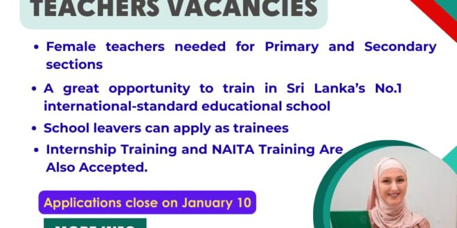 அக்குரணையில் உள்ள பிரபல சர்வதேச பாடசாலைக்கு ஆசிரியர்கள் தேவை English/Literature (Gr 06 to 11) Islam Primary Teacher(English …