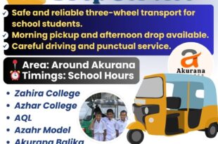 அக்குறணை பகுதியில் பாடசாலை மாணவர்களுக்கு பாதுகாப்பான மற்றும் நம்பகமான ஆட்டோ வாகன போக்குவரத்து சேவை . Safe and reliable …