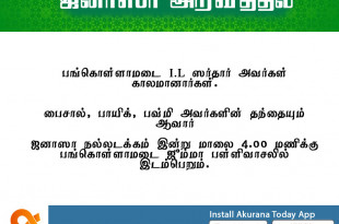 பங்கொள்ளாமடை I.L ஸர்தார் அவர்கள் காலமானார்கள். பைசால், பாயிக், பவ்மி அவர்களின் தந்தையும் ஆவார் ஜனாஸா நல்லடக்கம் இன்று மாலை …