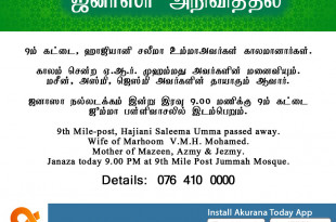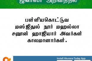 பள்ளியகொட்டுவ மஸ்ஜிதுல் நூர் மஹல்லாவை சேர்ந்த சனூன் ஹாஜி அவர்கள் காலமானார். அன்னார் மசீன் ஹாஜி அவர்களின் சகோதரரும், சfப்லீன் …
